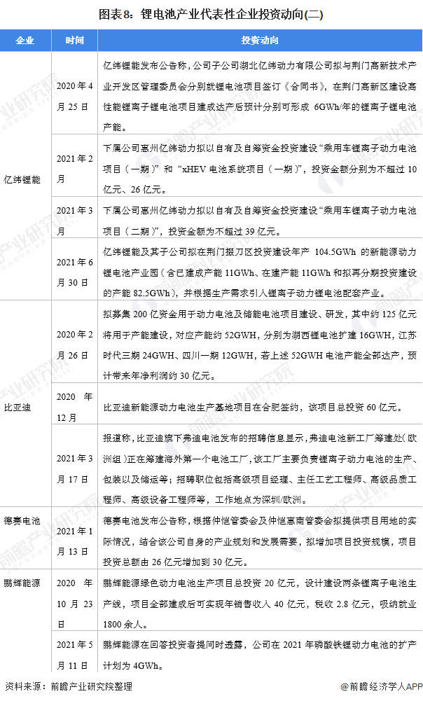 2020年以来,锂电池产业代表性企业的投资动向主要包括收购公司拓展业务、通过对子公司增资的方式投资锂电池生产基地项目。锂电池产业代表性企业最新投资动向如下: