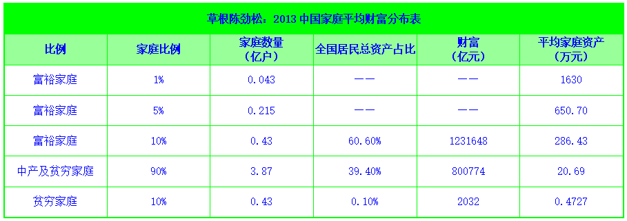 西南财经大学中国家庭金融调查研究中心《中国家庭财富的分布及高净值家庭财富报告》数据显示,2013年,中国家庭中,最富裕的1% 、5%,平均家庭资产分别为1630万元、650.7万元,中国家庭最富裕的10%,占全国资产(居民)60.6%,最贫穷的10%,占全国资产(居民)0.10%。
