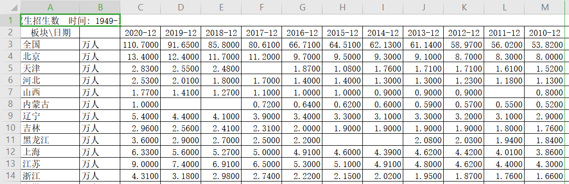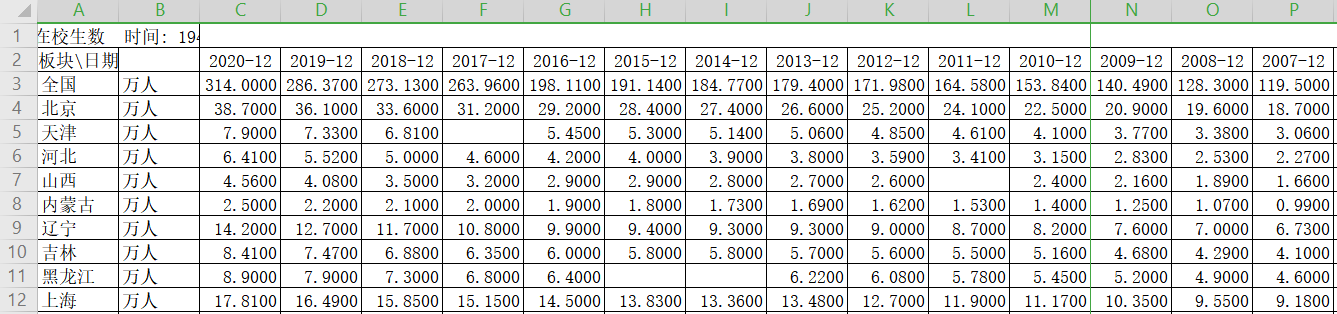 研究生招生数更新至2020年12月,2010年以后比较全面,往前数据有部分缺失研究生在校生数(每年12月份统计数据)更新至2020年12 月份,1999-2020年数据较为全面,之前数据有部分缺失研究生在校生数招生数,年度数据(2000-2020年)一、各省研究生在校生数(2000-2020年)
