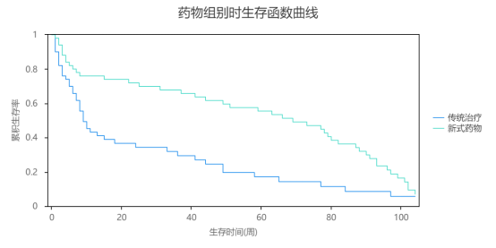 上图可以明显的看出,‘新式药物’的生存率会明显的高于‘传统治疗’方案。而且‘新式药物’时,0-80周时生存率下降的幅度相对较小,但在80周后生存率下降幅度加大。‘传统治疗’方案来看,0~20周生存率下降非常明显,20周后生存率下降幅度相对较为稳定。无论如何,新式药物的生存率都会明显的高于传统治疗方案,整体说明,‘新式药物’起着明显的作用。