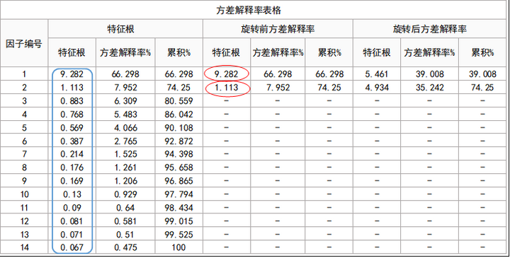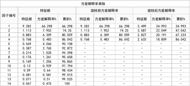 说明4个因子能够提取14个分析项86.042%的信息量,这个值没有固定标准,一般超过60%都可以接受。