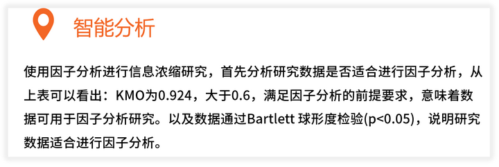 通常KMO值的判断标准为0.6。大于0.6说明适合进行分析,反之,说明不适合进行分析。同时Bartlett检验对应P值小于0.05也说明适合分析。
