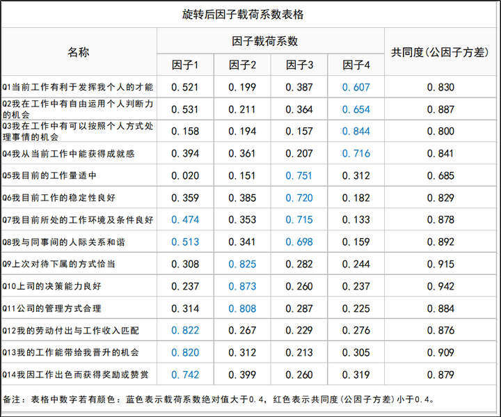 可以结合旋转后的因子载荷矩阵结果进行命名,最终将四个因子分别命名为F1工作报酬、F2领导管理、F3工作环境、F4个人发展。
