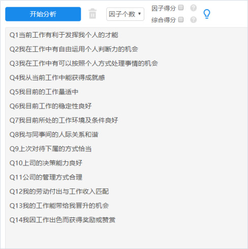 关于工作满意度有14个问题,调研得到215份问卷结果。希望通过因子分析,用少量因子反映14个题目的信息,从而达到降低维度,便于分析的目的,并对因子命名用于后续分析。