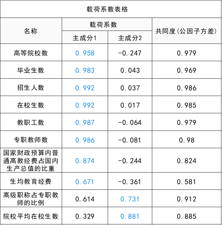 蓝色数值代表载荷系数绝对值大于0.4,如高等院校数对应的载荷系数(0.958,-0.247)说明这个分析项更适合归于主成分1下。