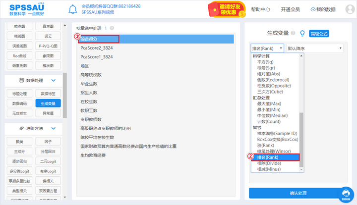 【数据处理】→【生成变量】里的排名功能。点击“综合得分”,再选择“排名(Rank)”,点击确认处理。