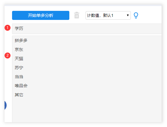 除了CochranQ检验外,有时候需要进行差异对比,比如本次例子中,想对比不同学历的群体,他们选择网购平台的偏好上是否有明显的差异性呢?此时就可使用SPSSAU的‘单选-多选’方法,学历是单选,网购平台偏好是多选,操作如下: