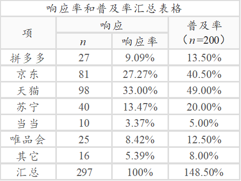 除了上述的基本百分比分析之外,还可进一步利用深入分析。比如本次案例里面98个样本选择‘天猫’,总样本是200个,占比是98/200=49%。这种百分比叫做‘普及率’。除此之外还有一种占比叫做‘响应率’,如下图: