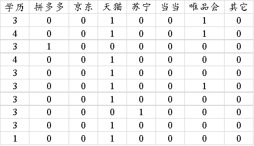 当前有一项研究电子商务网购平台的偏好数据,并且想分析学历与网购平台的偏好差异性情况。总共收集200个样本,数据如下图所示(图中仅列出10个样本数据)。