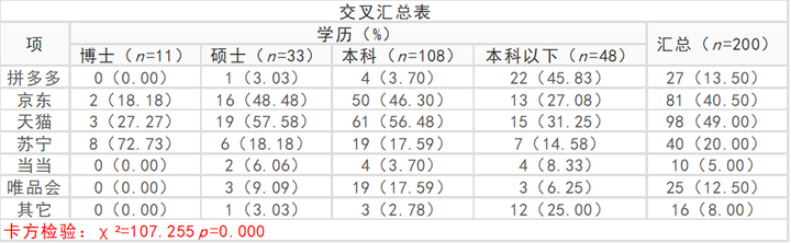 首先看P值,P值为0.000<0.01,意味着各学历群体,他们对于网购平台的偏好上有着显著性的差异,即各学历群体他们很可能使用不同的网购平台。