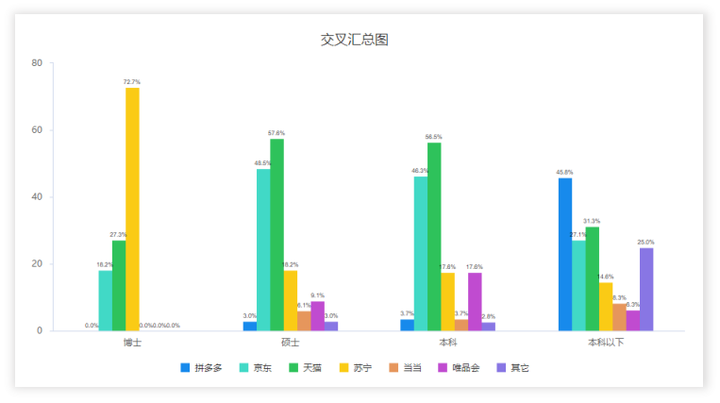 还有一种更高级的多元统计方法叫做‘对应分析’,其是利用‘相关’的原理,比如高学历群体有没有更偏好于京东平台呢,低学历有没有更偏好于拼多多呢。
