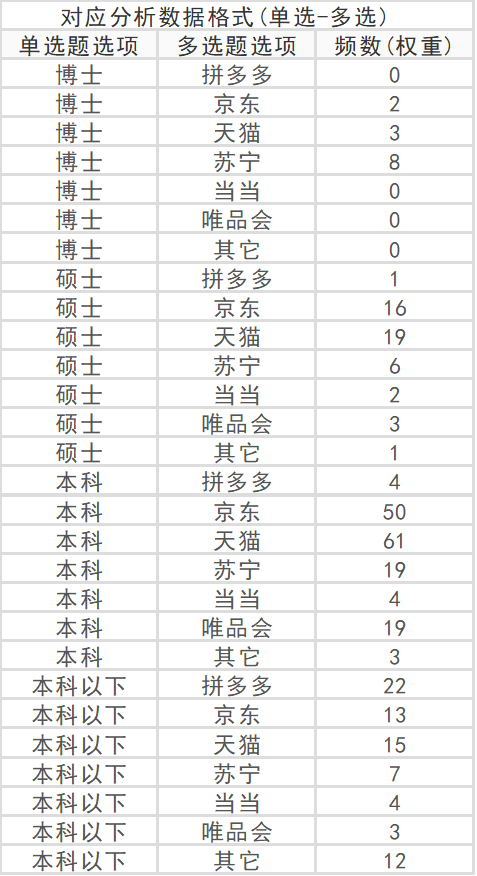 如果分析学历和网购平台偏好的差异性,那么可使用卡方检验,卡方检验是利用差异的原理进行分析。