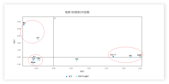 上图可以看到:本科、硕士、天猫、京东和唯品会这几个点挨在一起,其说明了本科和硕士这两类群体,他们使用天猫、京东和唯品会这3个平台的偏好更强。而本科以下,其它与拼多多挨在一起,说明本科以下低学历群体更可能使用拼多多。除此之外,博士学历群体更偏好于使用苏宁。