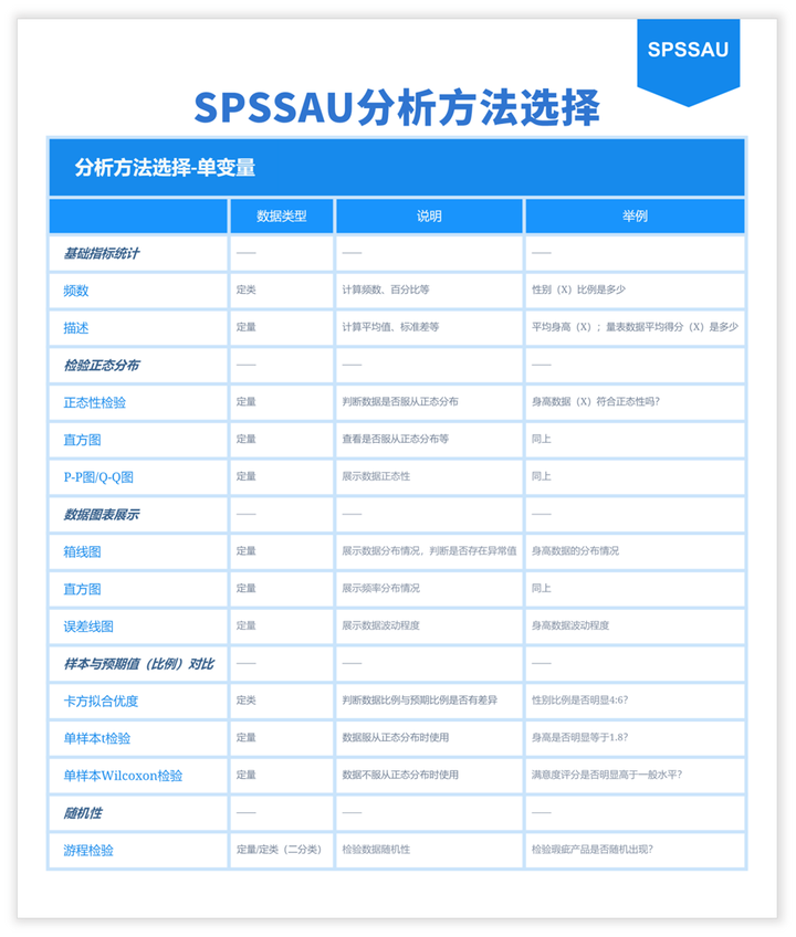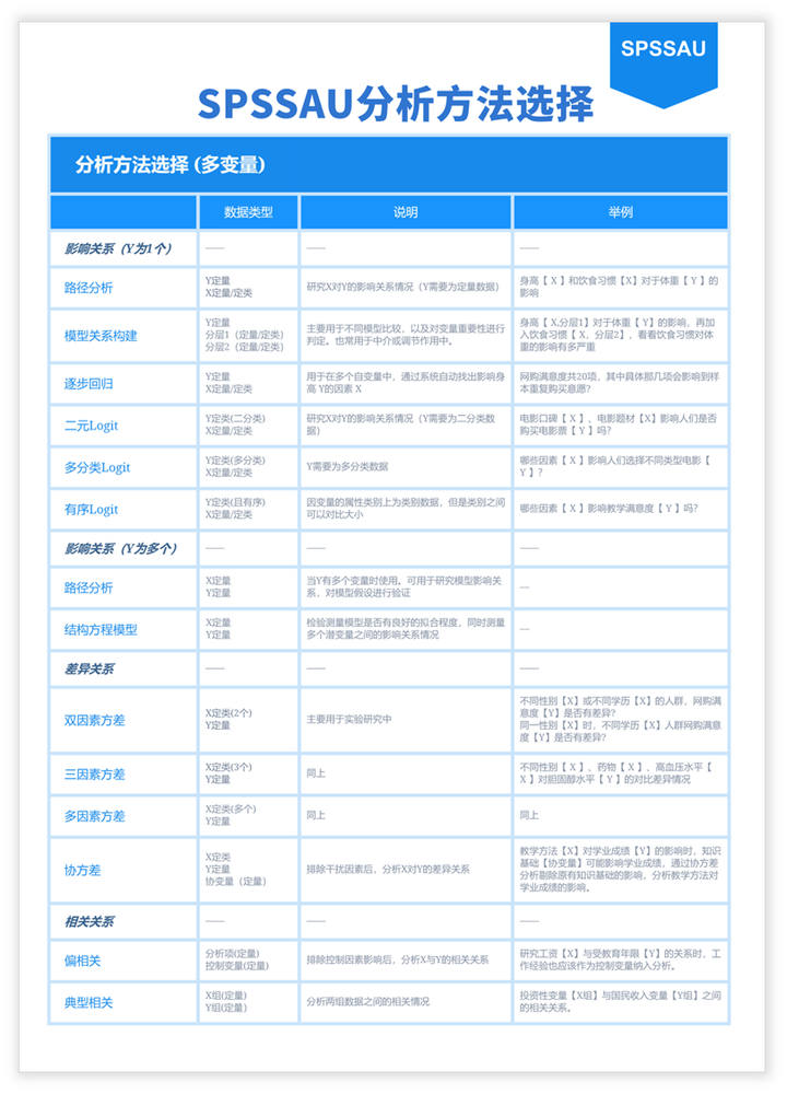 每种方法的使用场景不是固定不变的,这里的只提供最常见的用法,帮助初学者快速了解快速选择,更多的方法介绍请参考SPSSAU帮助手册