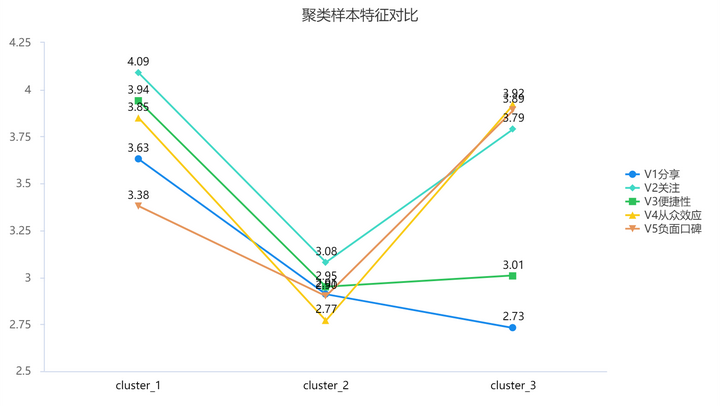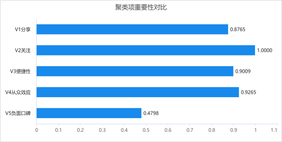 分析前已经进行因子分析,提取出5个主因子,分别命名为分享、关注、便捷性、从众效应、负面口碑,接下来使用这5个指标,对样本进行聚类分析。