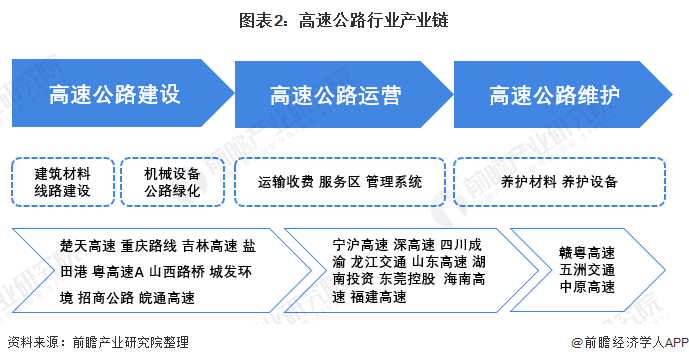 中国高速公路产业包括公路建设、公路运营、公路维护三大环节。公路建设主要包括线路建设、建筑材料、机械设备、公路绿化;公路运营包括运输收费、服务区、管理系统;公路维护包括养护设备、养护材料,中国高速公路公司多基于公路建设纵向布局,产业链跨度广。