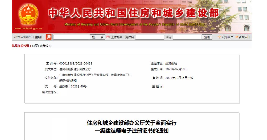 今天,住房和城乡建设部办公厅发布《住房和城乡建设部办公厅关于全面实行一级建造师电子注册证书的通知》(下面简称《通知》),10月15日起,将在全国范围内实行一级建造师电子注册证书。