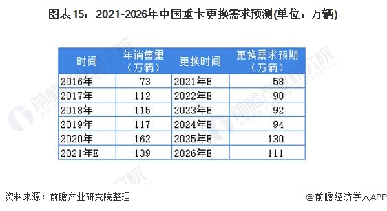 当重卡行使超过100万公里后,就需要开始大修,而长途运输对卡车性能要求又相对较高,因此当重卡行使100万公里后,车主就会开始考虑换车。假设平均一辆重卡年行使里程在20万公里左右,那么在使用5年后,重卡进入换车周期。从卡车需求来看,卡车消费主要是集中在换车需求上,每年的卡车需求中有超过60%的需求是由换车需求引起的。由于中国卡车保有量的基数非常高,保守估计换新车率为80%,则未来平均每年会有超过60万辆卡车需要进行更换,而这种更换需求具有相对的刚性。