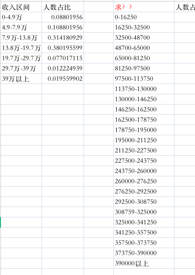 已知7个区间段收入的人数分布,如何求七个区间段内更为细致划分的小区间收入人数?(假设收入分布符合指数分布)