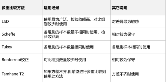 - 如果方差分析显示没有差异性,则不需要进行事后多重比较。