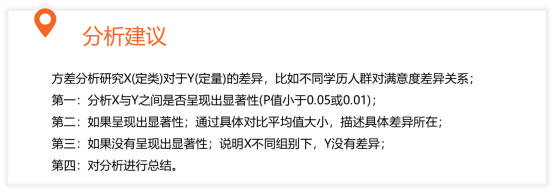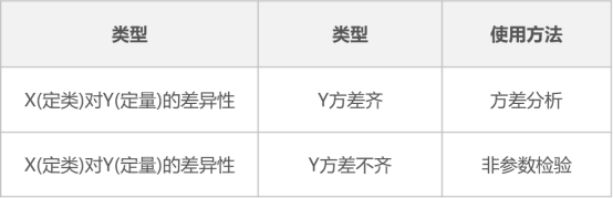 方差分析用于分析定类数据与定量数据之间的关系情况,可以比较2组或多组数据的差异。分析前首先应根据数据类型判断使用的方法是否正确。