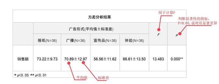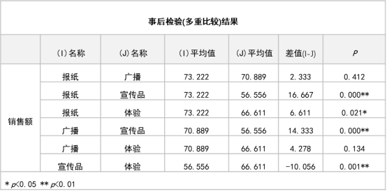 本例中X项一共分为4组,则有6种两两对比的组合,也就对应有6个对比结果。根据结果显示报纸和宣传品、报纸和体验、广播和宣传品、体验和宣传品之间存在显著性差异,通过平均值对比具体对比差异性。