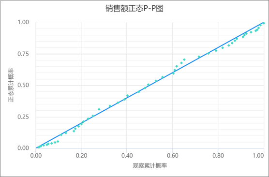 P-P图中散点近似呈现为一条对角直线,则说明数据呈现出正态分布。