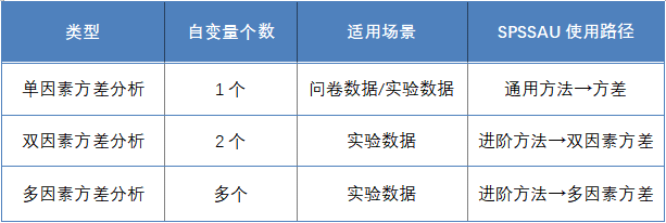 方差分析按照自变量个数的不同,可以分为单因素方差分析、双因素方差分析、以及多因素方差分析。