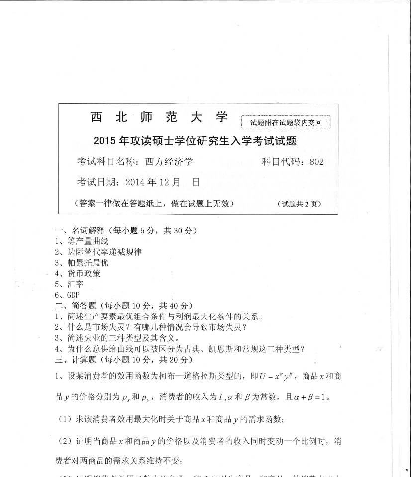 802西方经济学(西北师范大学2015年攻读硕士学位研究生入学考试试题).pdf