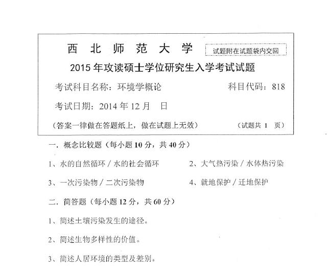 818环境学概论(西北师范大学2015年攻读硕士学位研究生入学考试试题).pdf