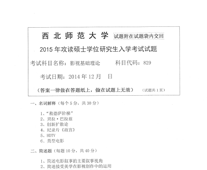 829影视基础理论(西北师范大学2015年攻读硕士学位研究生入学考试试题).pdf