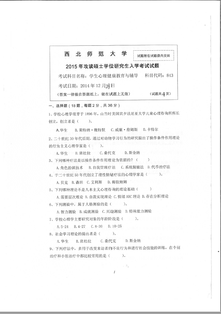 843学生心理健康教育与辅导(西北师范大学2015年攻读硕士学位研究生入学考试试题).pdf