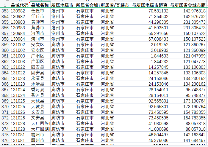 数据名称:全国各省/市/县经纬度、区县与地级市和省会的距离