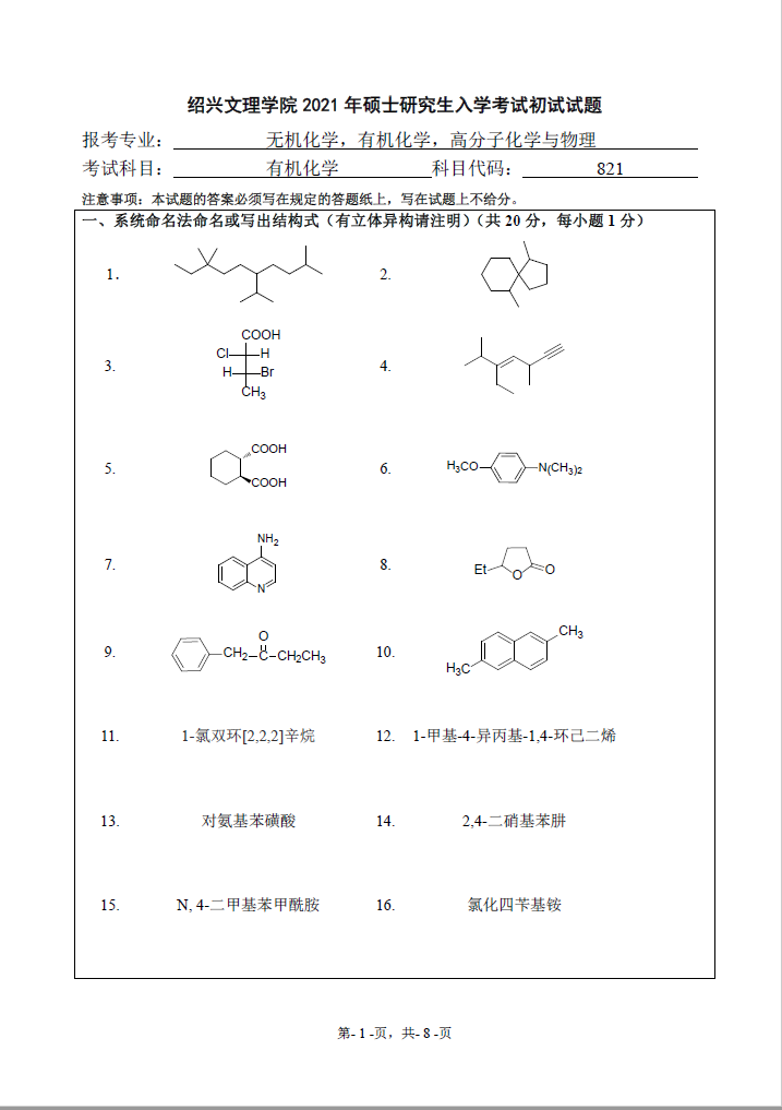 821 有机化学(绍兴文理学院 2021 年硕士研究生入学考试初试试题).rar