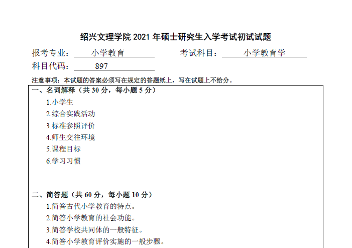 897 小学教育学(绍兴文理学院 2021 年硕士研究生入学考试初试试题).rar