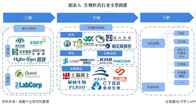 生物医药产业链的上游为基础研究的开展,通常是由独立医学实验室,即第三方检测中心完成,有部分医院亦设有独立实验室,可承担一部分医药外包的项目。中游为生物医药制造,包含疫苗、血液制品、诊断试剂以及单克隆抗体领域。下游为消费终端,分别为医疗机构(含医院、基层医疗卫生机构、专业公共卫生机构)以及医药零售终端(包括实体药店以及电商平台)。