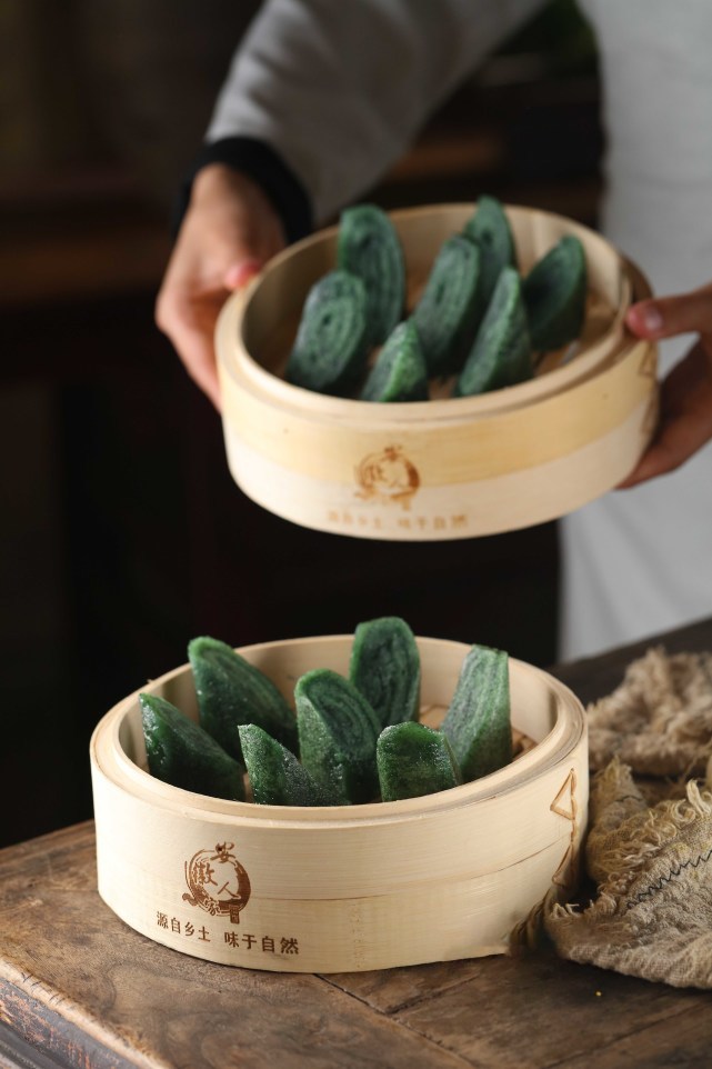 香米糕的原料取自高山上的艾草,将艾叶上锅蒸熟后,用搅拌机打磨成细细的粉末,再和到打碎的米浆里大力搅拌,搅得越均匀,香味越浓郁。口感Q弹软滑,又带着一些甜味,似乎把大自然的味道也跟着搅拌了进去~