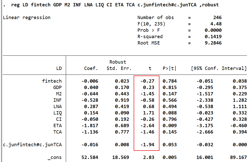 回归命令用的reg LD fintech GDP M2 INF LNA LIQ CI ETA TCA c.junfintech#c.junTCA ,robust,验证金融科技对银行的影响会不会受到银行资本充足率的影响