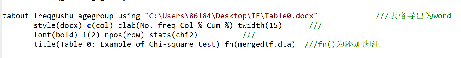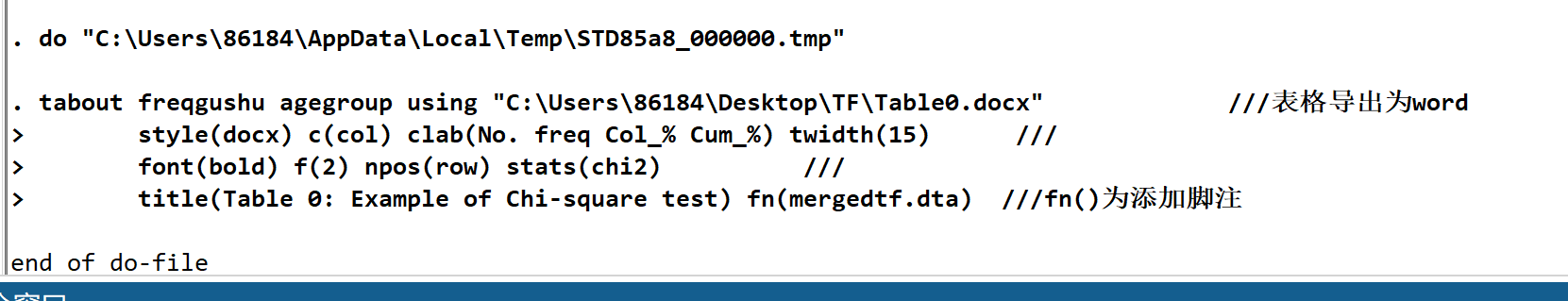 但是在dofile中,点击如下代码运行,在结果部分显示没有报错,但导出的word表格却在对应的文件目录下找不到。下图为dofile文件中程序: