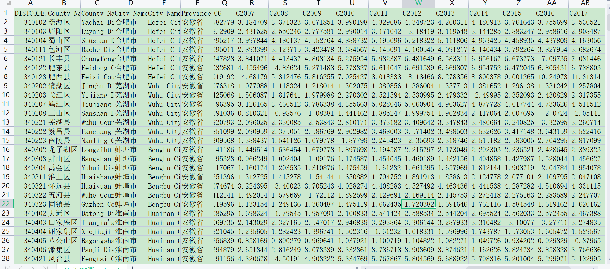 数据指标:地区编码、所在地区、所属地级市、所属省份、年份、CO2排放