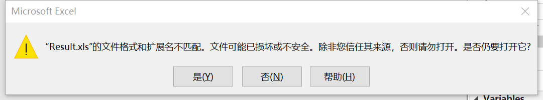 采用以下指令输出数据,打开Excel,提示【“result.xls”