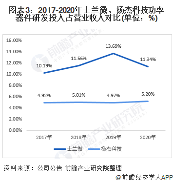 从公司功率器件产能及研发投入情况来看,士兰微均绝对领先扬杰科技,2020年,士兰微公仔器件产能2840亿只且处于产能扩张阶段,扬杰科技仅410亿只。研发投入士兰微连续多年为扬杰科技的两倍左右。2020年研发投入占比超过11.34%,而扬杰科技仅为5.2%。