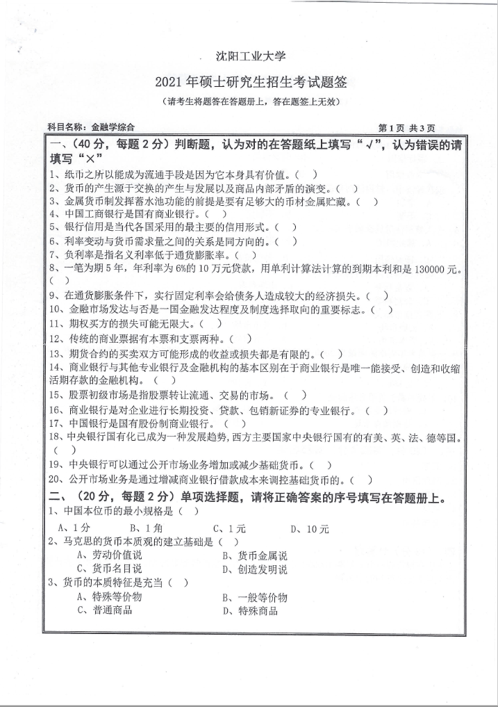 431 金融学综合(沈阳工业大学2021年硕士研究生招生考试题签).rar