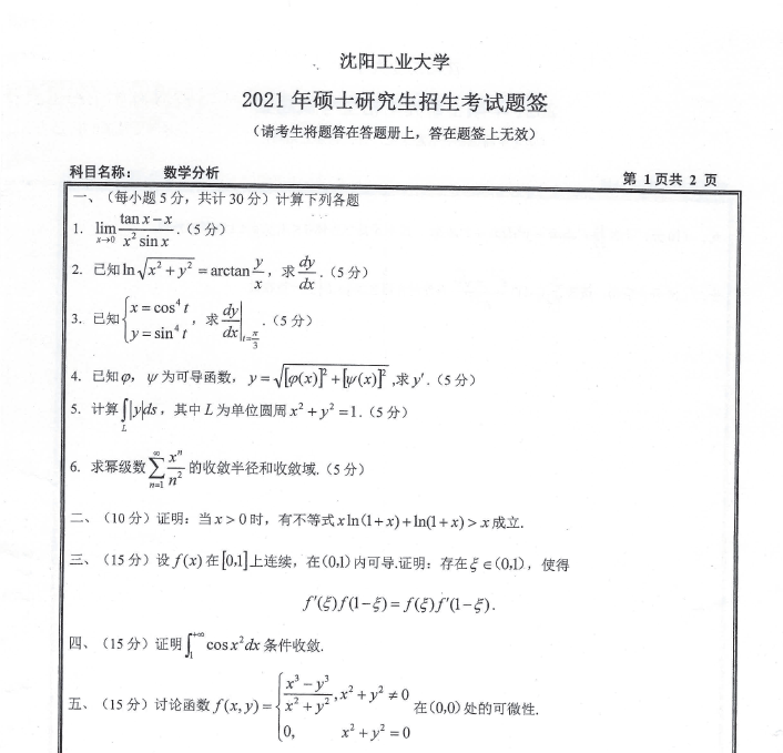 611 数学分析(沈阳工业大学2021年硕士研究生招生考试题签).rar