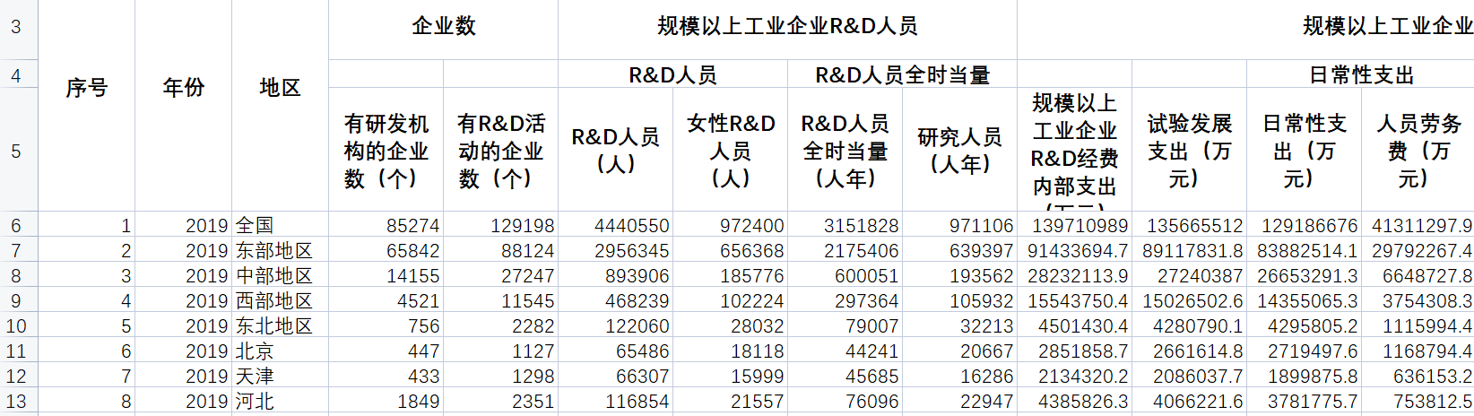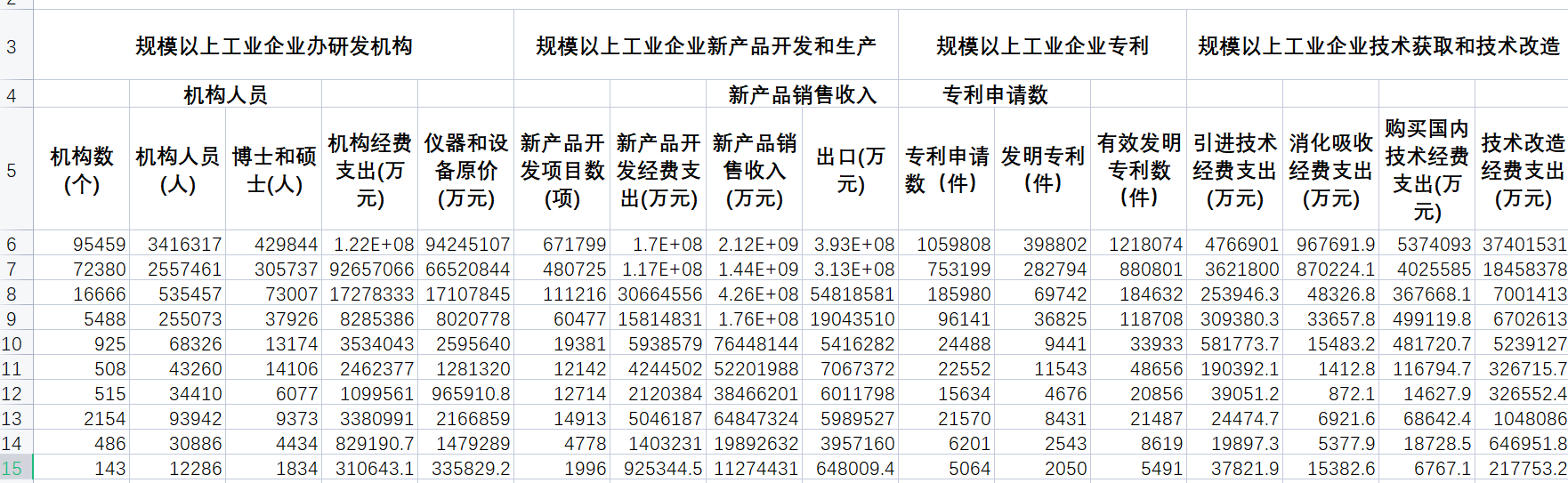 科技工业企业主要指标:有研发机构的企业数(个) 有R&D活动的企业数(个) R&D人员(人) 女性R&D人员(人) R&D人员全时当量(人年) 研究人员(人年) 规模以上工业企业R&D经费内部支出(万元) 试验发展支出(万元) 日常性支出(万元) 人员劳务费(万元) 资产性支出(万元) 仪器和设备(万元) 政府资金(万元) 企业资金(万元) 规模以上工业企业R&D经费外部支出(万元) 对境内研究机构支出(万元) 对境内高校支出(万元) 项目数(项) 项目人员折合全时当量(人年) 项目经费支出(万元) 机构数(个) 机构人员(人) 博士和硕士(人) 机构经费支出(万元) 仪器和设备原价(万元) 新产品开发项目数(项) 新产品开发经费支出(万元) 新产品销售收入(万元) 出口(万元) 专利申请数(件) 发明专利(件) 有效发明专利数(件) 引进技术经费支出(万元) 消化吸收经费支出(万元) 购买国内技术经费支出(万元) 技术改造经费支出(万元)
