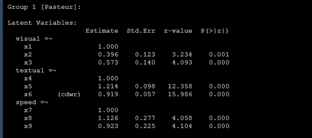 HS.model <- ' visual =~ x1 + x2 + x3 textual =~ x4 + x5 + c(codewar,codewar)x6 speed =~ x7 + x8 + x9 '上面的这个代码就将组间的x6的系数都固定为了codewar,当然这个codewar都是可以换的哈,你换成你的名字都是无所谓的,只要是一样的就行,就表示我限制两组间x6的载荷必须是相同的,那么结果如下: