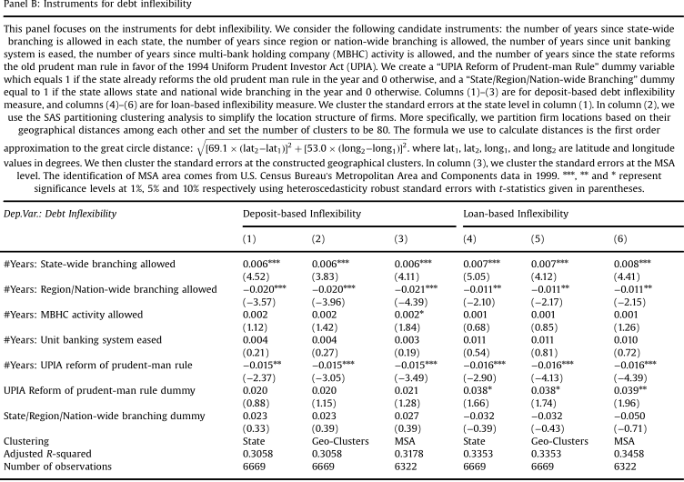 这个面板的重点是债务不灵活性的工具。我们考虑以下的候选工具: 自从每个州允许全州分支以来的年数,允许地区或全国分支以来的年数,单位银行体系放宽以来的年数,允许多家银行控股公司(mbhc)活动以来的年数,以及自从国家改革以来的年数,老的审慎人规则支持1994年统一审慎投资者法案(upia)。我们创建了一个“谨慎人规则的 upia 改革”的虚拟变量,如果国家已经改革了旧的谨慎人规则,这个变量等于1,如果国家允许国家和全国范围的分支,这个虚拟变量等于1,否则等于0。第(1)-(3)列用于基于存款的债务不变性衡量,第(4)-(6)列用于基于贷款的不变性衡量。我们将标准错误集中在第(1)列的状态级别。在第(2)列中,我们使用 sas 划分聚类分析来简化企业的区位结构。更具体地说,我们根据公司的地理位置彼此之间的距离划分公司位置,并将集群的数量设置为80个。我们用来计算距离的公式,是大圆距离的一阶近似: