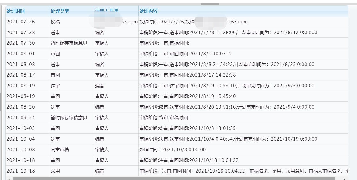 2021年7月份投稿 经历了将近三个月录用 其中终审超期一个月 后面又送决审 跟论坛的任何一个分享科技管理研究录用经验的前辈比 我的这篇稿子录用时间真的太长太煎熬了 尤其终审超期的那一个月 每天至少要登投稿系统三次 每次都是一动不动的进度条 那种苦苦等待煎熬的感觉实在太难受了 而且一超就超了一个月 我中间几度都觉得凉凉了 每次等的难受就来论坛刷前辈的投稿经验 想要从他们的经历中发现一丝能否录用的蛛丝马迹 终于 漫长的等待有了开心的结果 感恩论坛在迷茫的日子里给我的陪伴 现附上录用经过截图 也祝愿每一个看到此贴的努力发论文的小伙伴都能收获理想成果