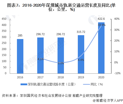 2016-2020年,深圳市轨道交通运营线路长度增幅明显,2020年同比增速大幅增长至33.9%。