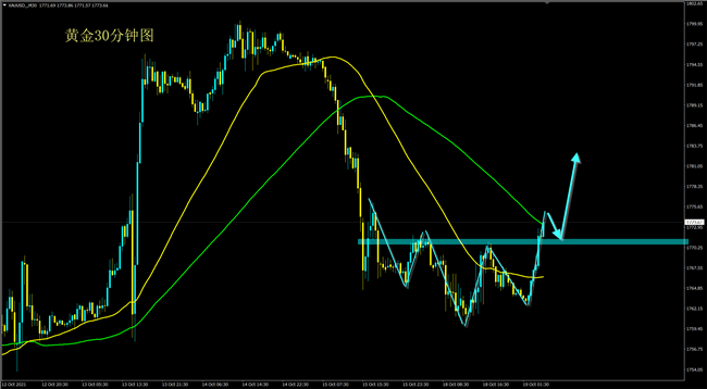 黄金今日强势拉升,并突破1770压制,30分钟构建头肩底形态,行情转多!回撤要直接干多了,依托1770支撑多!